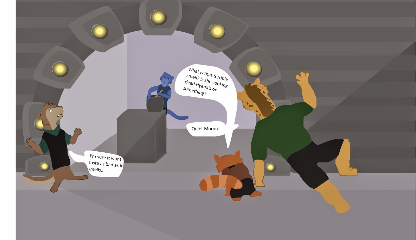 I got feedback on the characters and it seemed that their body shapes were a bit too similar. They all posessed the "fit" body shape. I saw the problem when I made the characters silloettues. It was mainly between the panther and the wolverine. Decided to fiddle around with the characters bodies. I made the red panda rounder and the Hyena muscular to make sure there would be no confusion there. I then tried to change the wolverine but in the end I decided to change the animal to make him more distinctivly different.